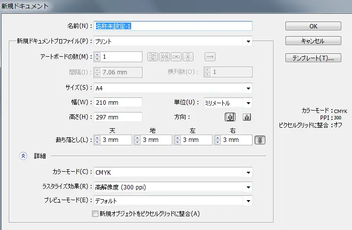 設定は「プリント」(ウェブはウェブサイトの製作に使います。) アートボード数、一気に何個も作る場合は2~10など数字を入れて下さい。