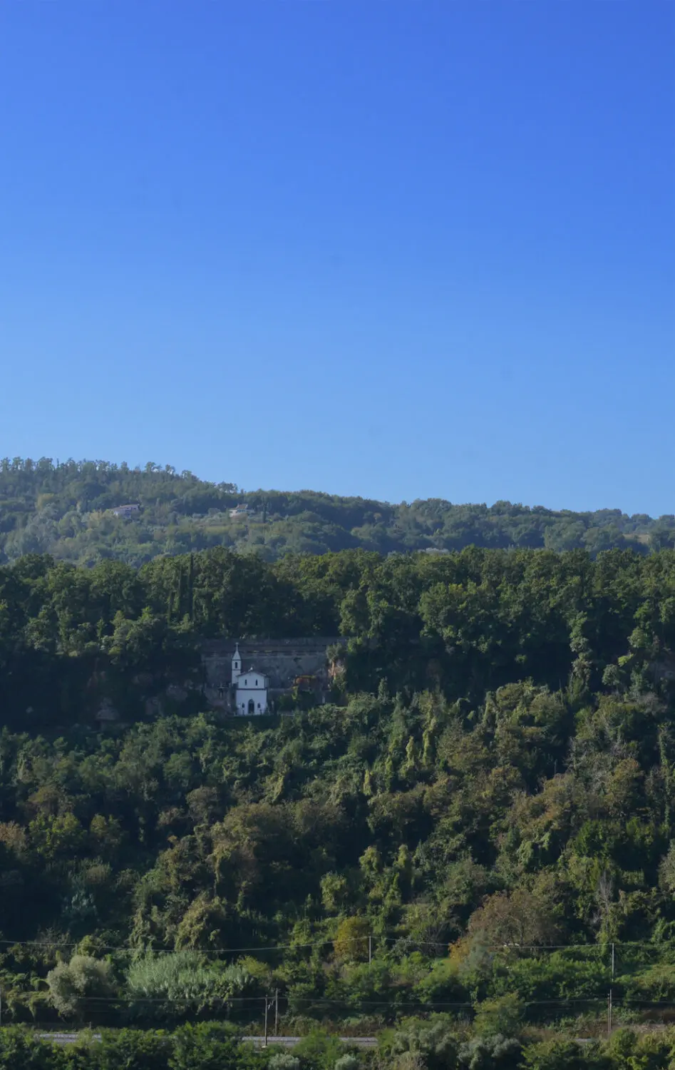 まずは街の入り口の駐車場に車を停めて。駐車場から周囲を見渡せば、すでにそこがかなりの高台になっているということが分かります。そしてふと、丁度対面にある穏やかな山に視線を投げると、山の中腹に教会を見つけました。