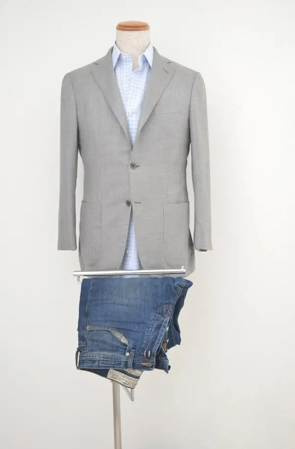 こんな感じですね。テーラードジャケットはスーツと同じような形をしたジャケットのことですが、スーツの上着ではありません。もちろん物によってはスーツの上着でもジャケパンに使えるものがあったりしますが、ごくわずかなうえ現在の流行とは異なるスタイルになってしまうことが多いので、基本的には専用のテーラードジャケットを用意しましょう。