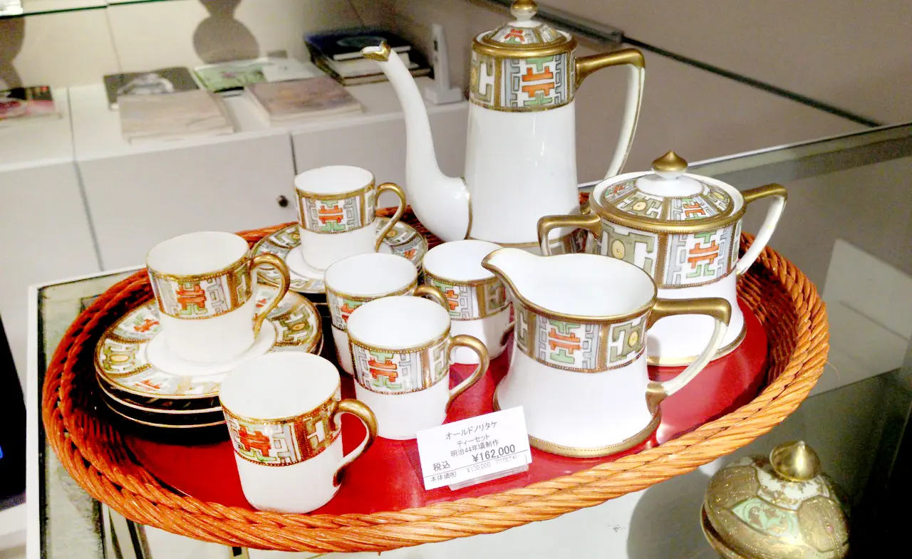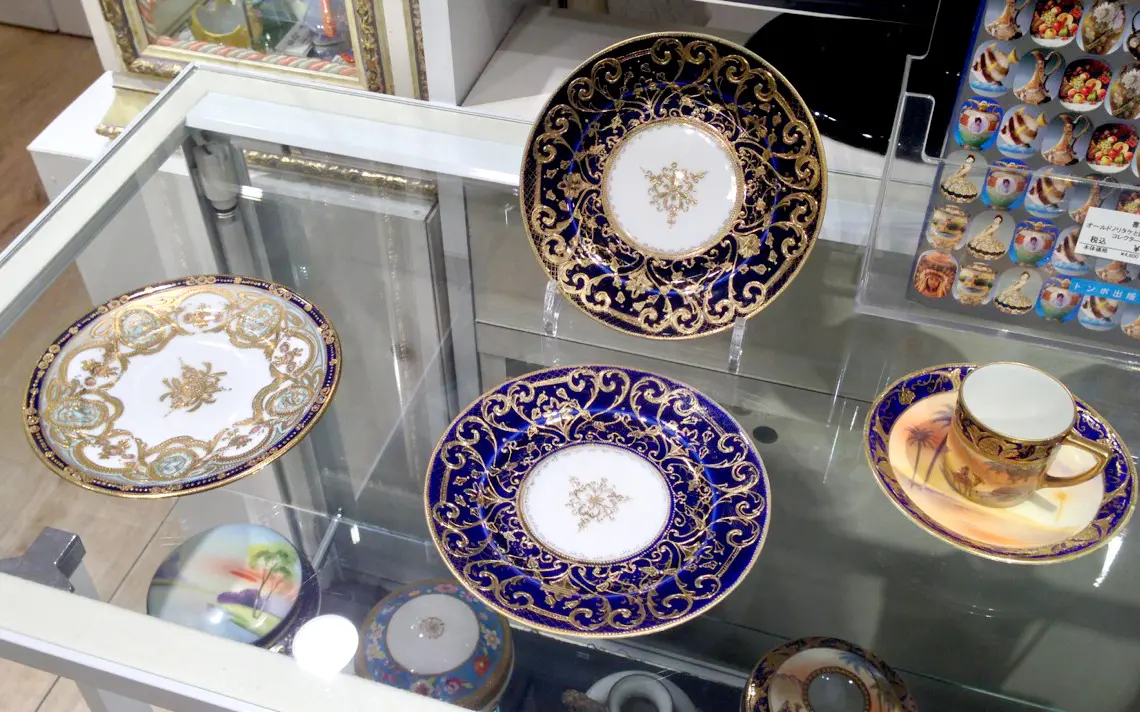 私も以前、横浜のみなとみらいでタカラダというお店でオールド・ノリタケをじっくりと見たことがあるのですが、緻密な金彩加工で色合いが独特なのに圧倒された覚えがあります。