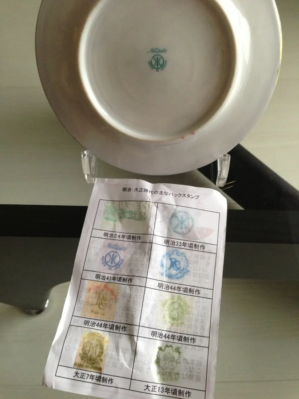 ウェッジウッドなどと同じように、後ろのバックスタンプによって大まかな製造時期が分かるそうです。ここのお店はとっても優しく、解説のプリントまで付けてくれました。