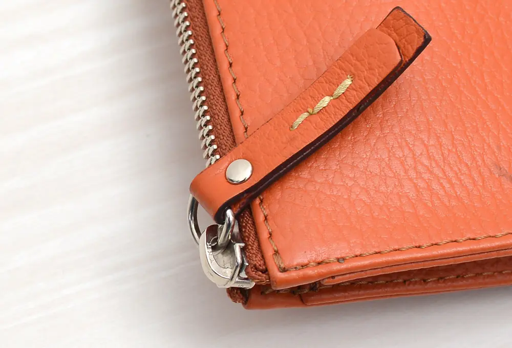このクラッチはビビッドなオレンジ色が特徴で、着こなしのアクセントになるようなちょっとした存在感のあるアイテムですが、それでも革質が良いため安っぽさはまったくありません。最初は流石に気が引けるほどオレンジでしたが、しばらく使うことで色が落ち着き、今にいたります。