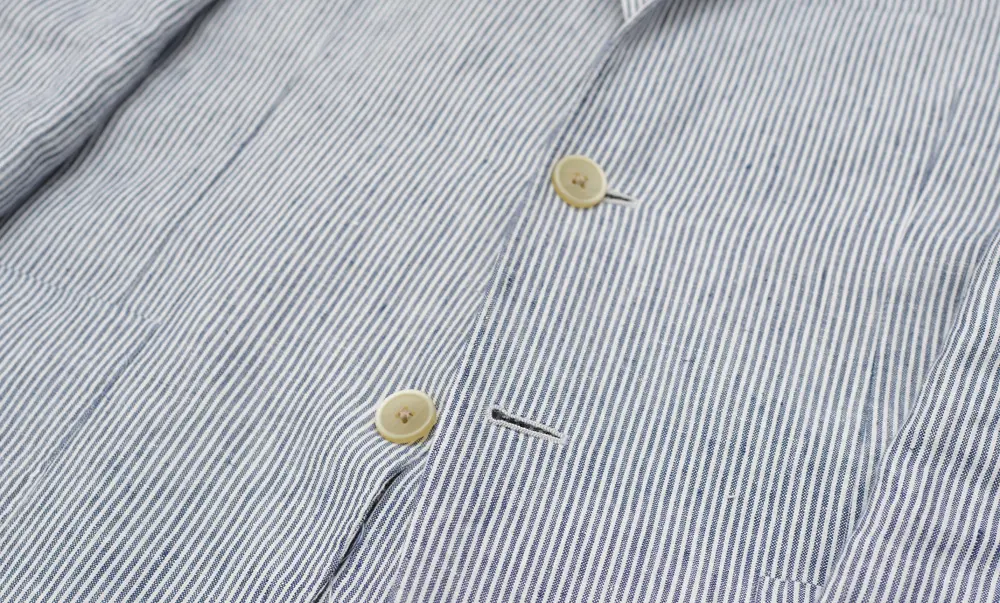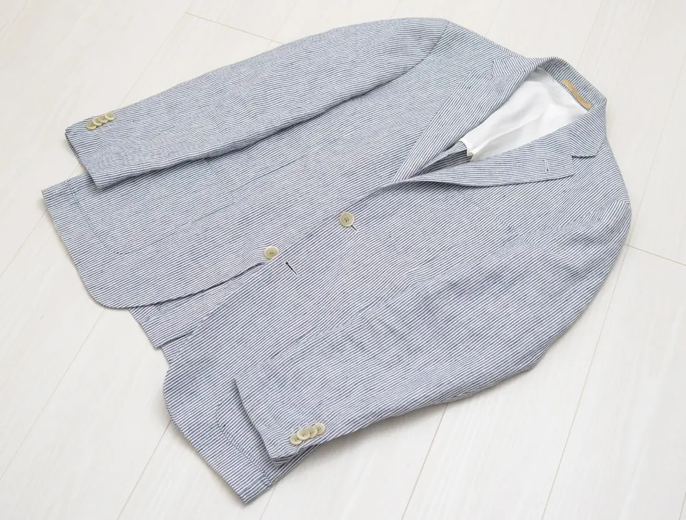 このラミーは先ほども少し書きましたが、普通の麻に比べるとずいぶんと滑らか。ちょうどサルトリオやスティレラティーノのようなサルトリアが用いる麻に似た、贅沢で光沢感のある麻ですね。細いストライプはどちらかというとシャツのような柄ですが、薄手の生地に背抜きの軽快な仕立てなので逆にこの柄が合っている。