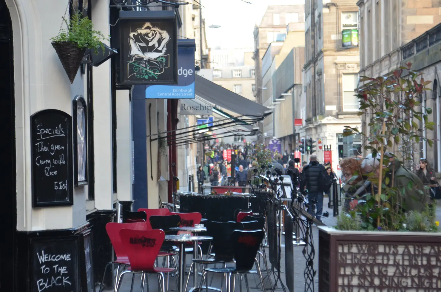 このローズストリートはかの有名なプリンセスストリートに平行して走る歩行者天国的なノリの通りで、オープン席のあるパブやレストランが立ち並ぶ通り。買い物などを楽しむプリンセスストリートに対し、ゆったりと座って時間を過ごせるのが嬉しいところ。旧市街や新市街の散策に疲れたら、休憩に使うのもいいかもしれません。