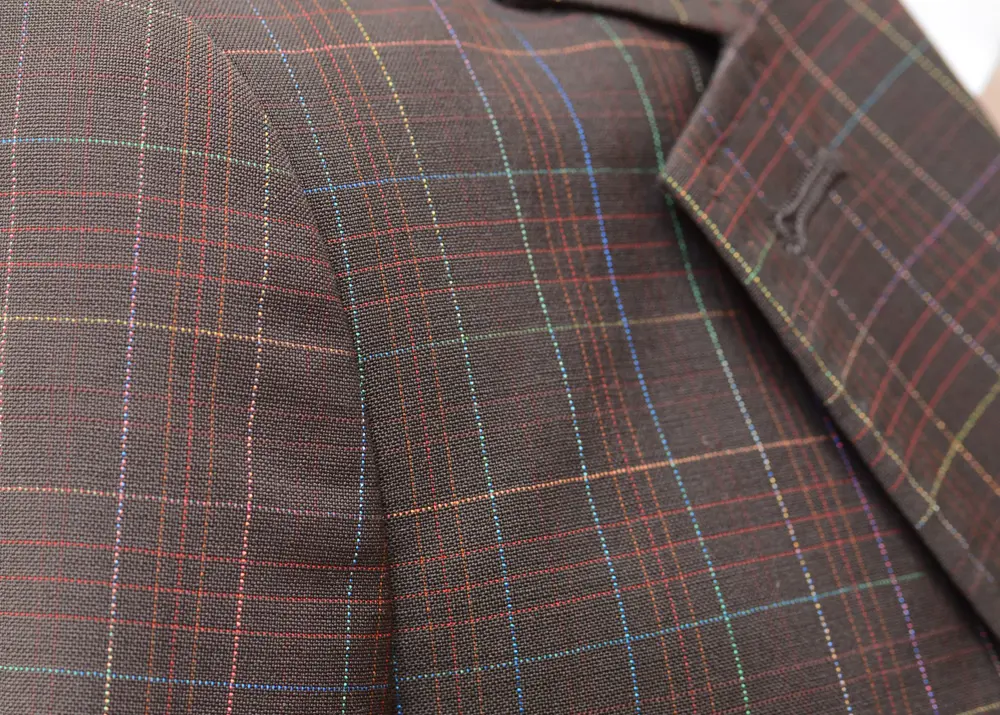 こちらのスーツの裏地はこんなド派手なマルチカラー。メンズのポールスミスで有名なマルチストライプをモチーフとしたこちらの裏地は、ビビッドな色使いで非常に存在感があります。