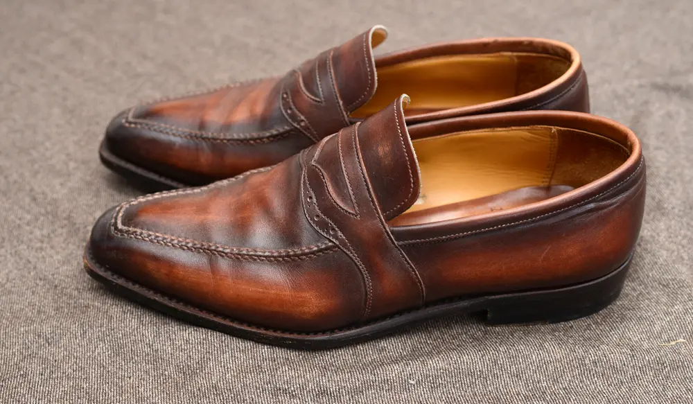 それに対し、しっかりとした品質の靴は先の写真のように手塗りで色むらを表現していたり、そうでなくても革が適度な光沢感と奥行きのあるしっとりとした風合いになっています。