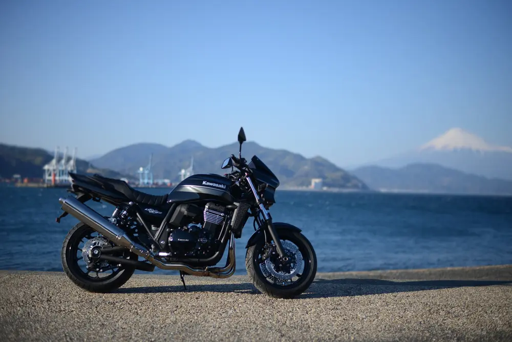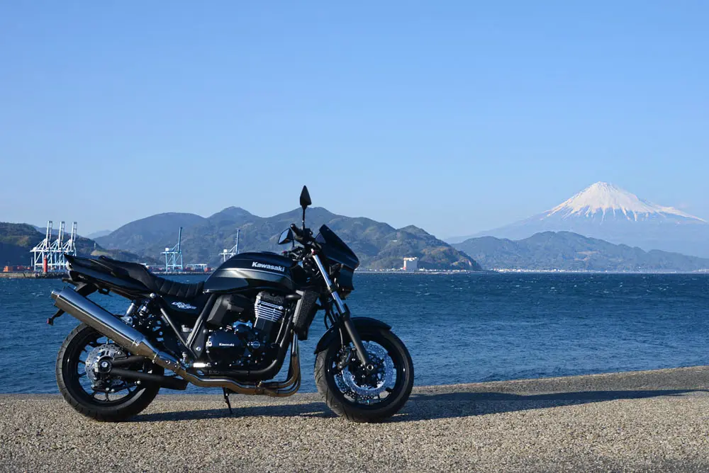 ですが、しっかり絞り込み背景までくっきり写すと「バイク」「海」「富士山」がバランスよく映ります。