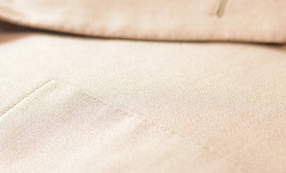 ポケットやラペルの端、ダーツ部分などジャケット全体を縁取る手縫いの繊細なステッチワーク、手作業で仕上げられる美しい縫い合わせ。