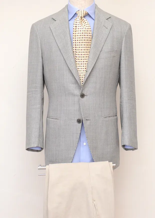 また着心地の良いジャケットが、あたかもストレッチ素材によって伸縮する生地で作られたジャケットのことであるかのように思われている現在においては、手縫い仕事による着心地の追求が正しく評価されないかもしれません。