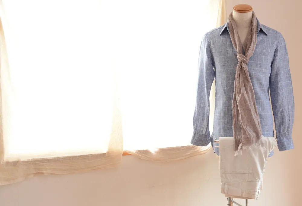 次に相性が良いのはコットン。少し使い込んでくたびれたコットンのジャケットに麻のシャツを合わせれば、イタリア流の着こなしになります。リネンコットンのシャツに、コットンのスーツであれば、春夏秋と3シーズンで着こなすことができます。