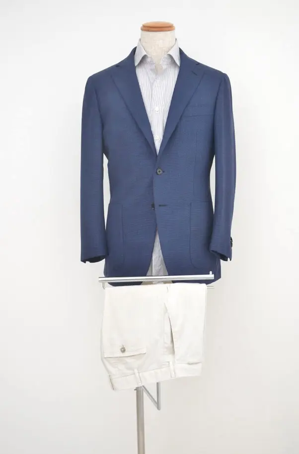 具体的に仕立ての良い紺のテーラードジャケットに、非常に明るいライトグレーや白に近いクリーム色のパンツがおすすめ。
