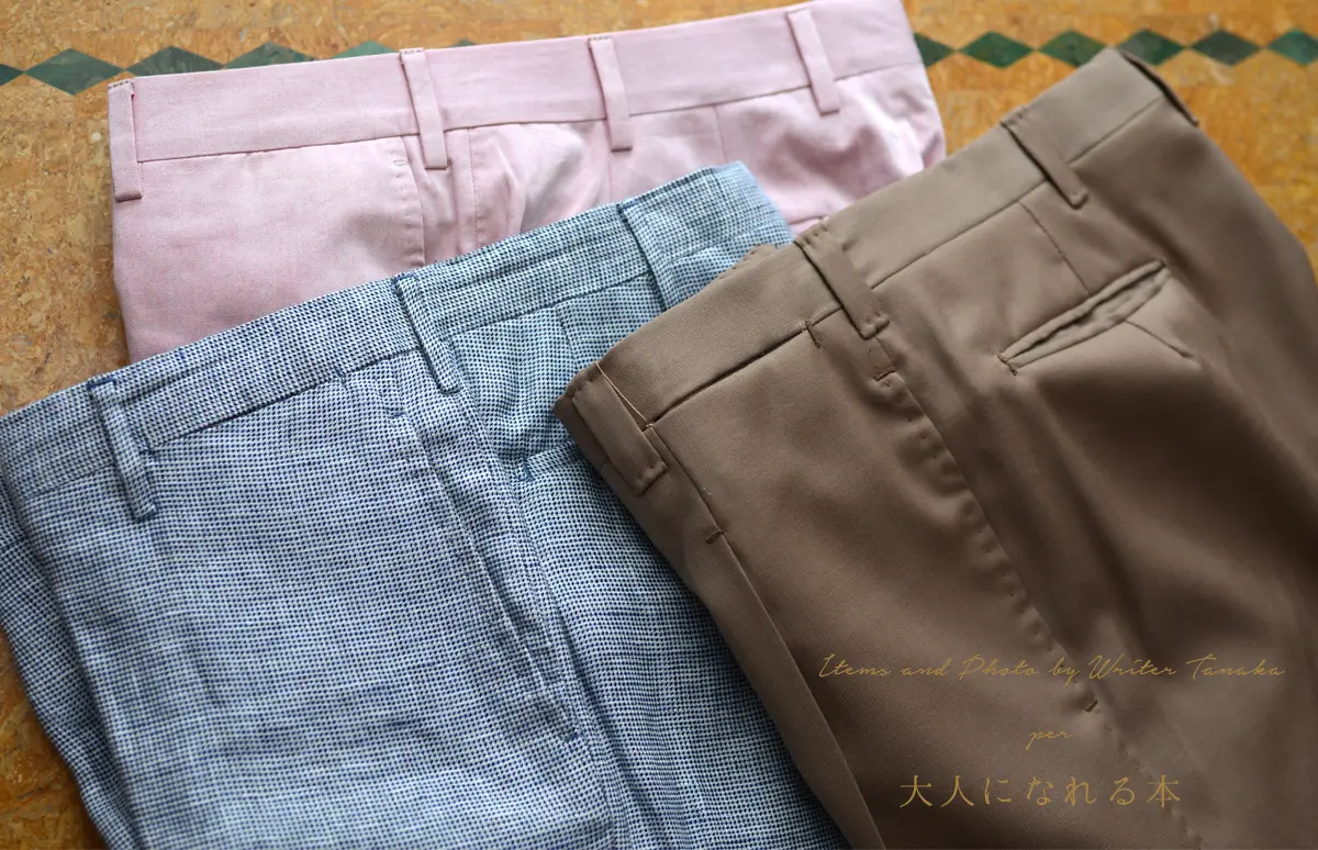 スマートカジュアルの場合、ジャケットに合わせるパンツはかなりドレッシーなジャケパンになりやすいウールのスラックス(写真右)でも良いですが、コットンや麻のパンツがおすすめ。