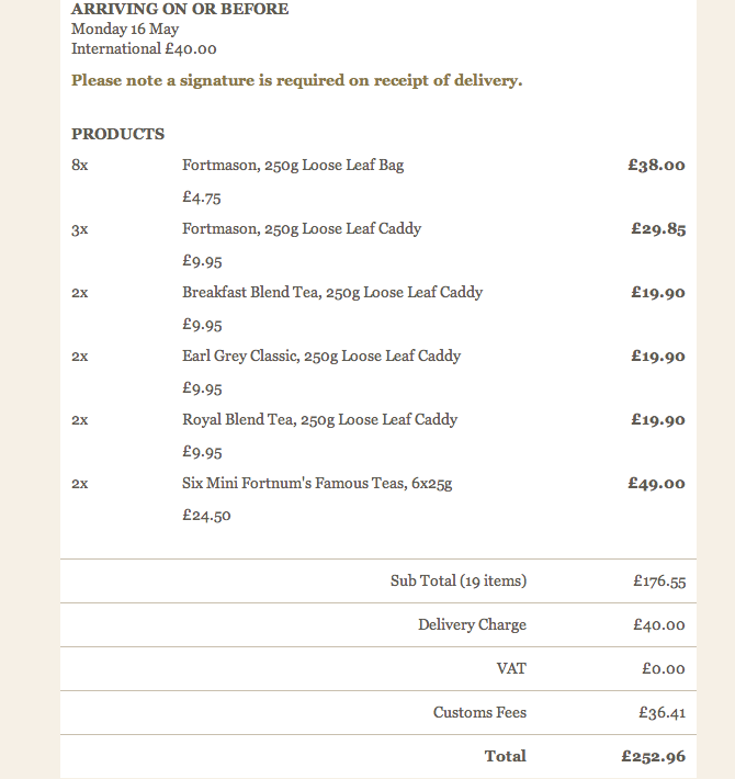 19アイテムを購入すると、デリバリーチャージ(送料)が40ポンド。