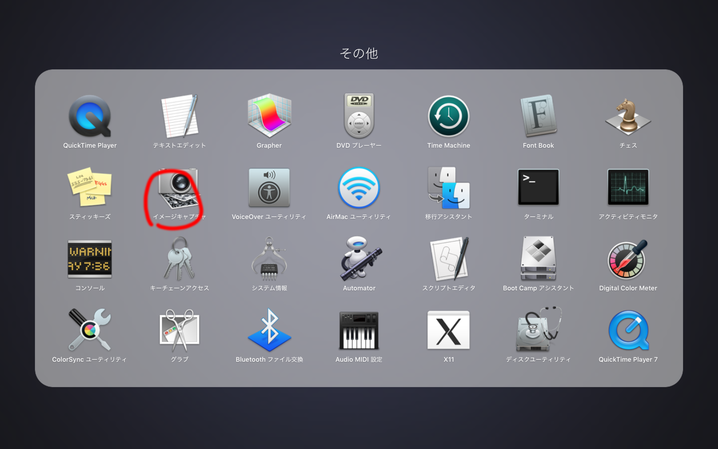 Macのメニューから「Launchpad」をクリックして、「その他」からイメージキャプチャを選びます。
