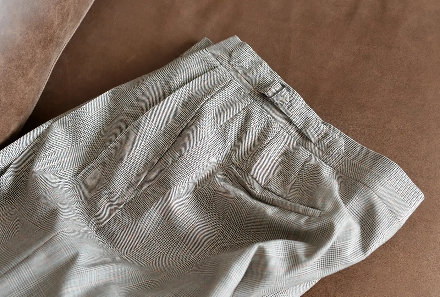 いかにも英国らしいグレンチェックのウールは、最高級の生地を作ることで有名なレッサー&サンズのもの。モヘヤのようなシャリ感があり、それでいながら柔らかさもある不思議な手触り。