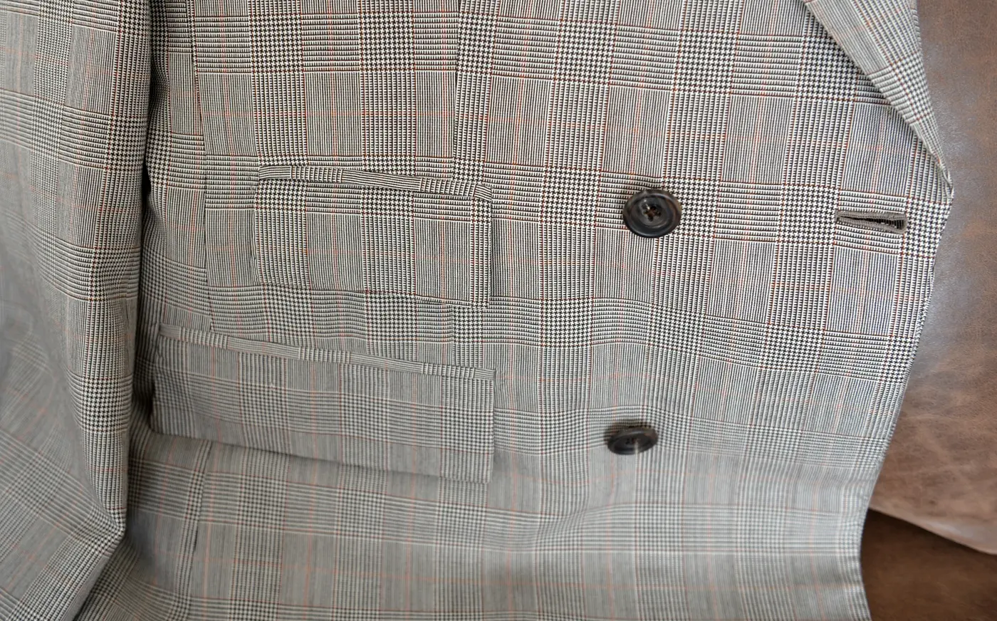 ダブルブレステッドに、チェンジポケット、サイドベンツ。