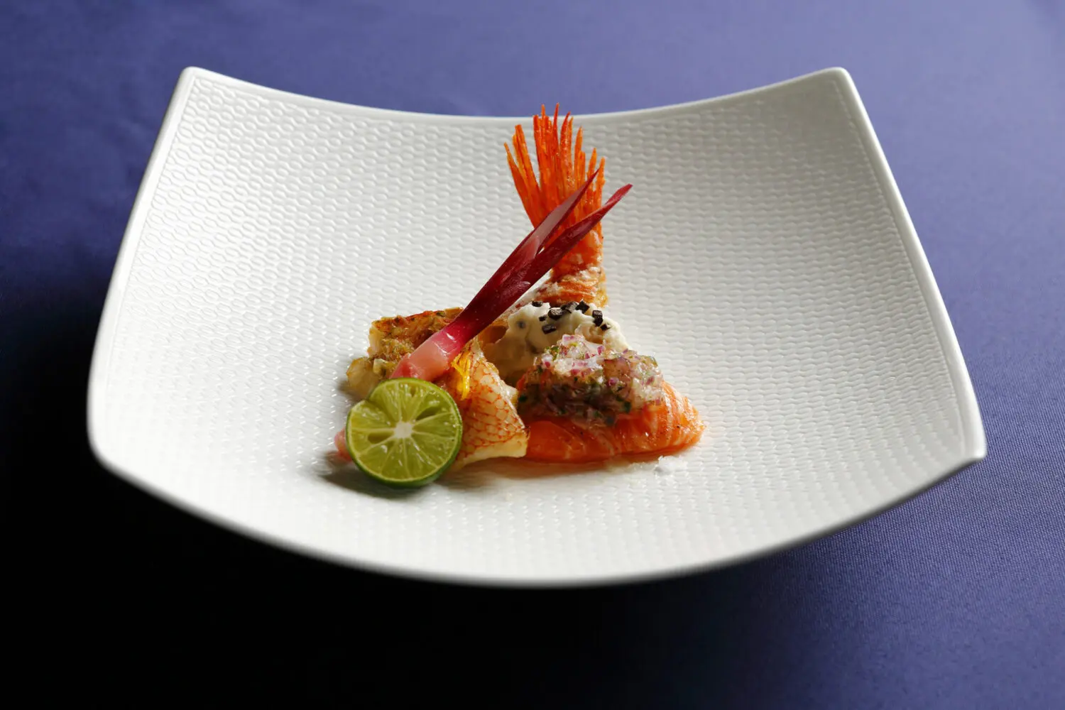 きんきはNobu Tokyoが得意とする魚の一つですね。軽やかでありながらもしっかりと身が立つこの魚に、エシャロットのサルサと熟したすだちを。香りと歯ごたえで織りなす繊細な味覚です。