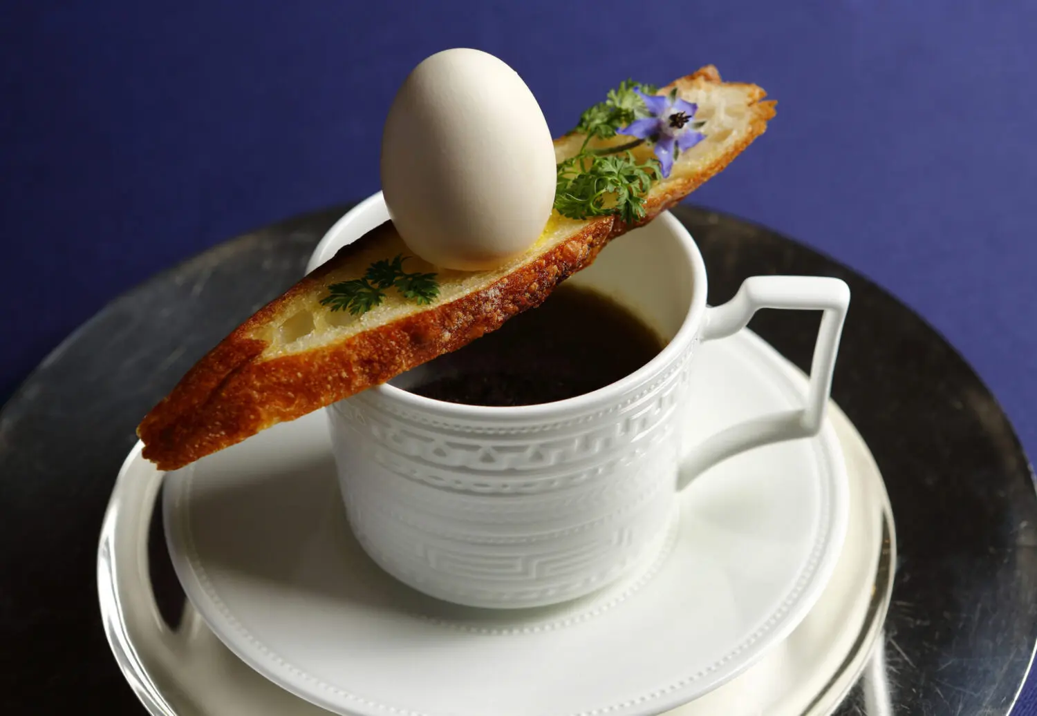 かの有名な独創的カクテル – ニコラシカを思わせる外見で現れたのは、コンソメのスープ。ブレッドに乗った卵の殻の中には野菜が仕込まれており、それをスープに落としつつ食べるといいます。