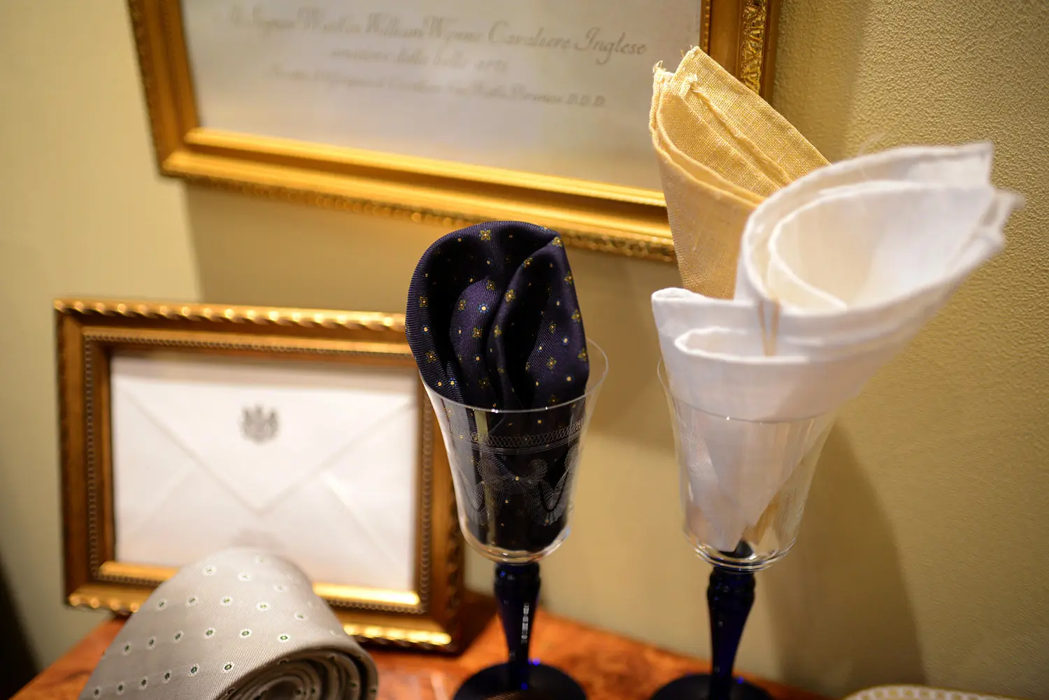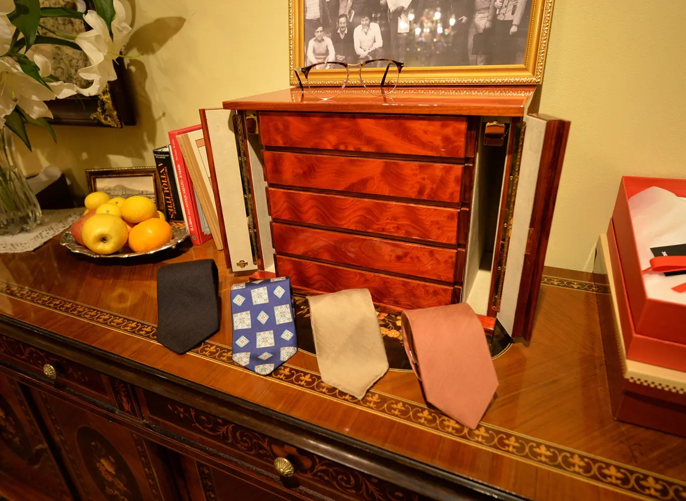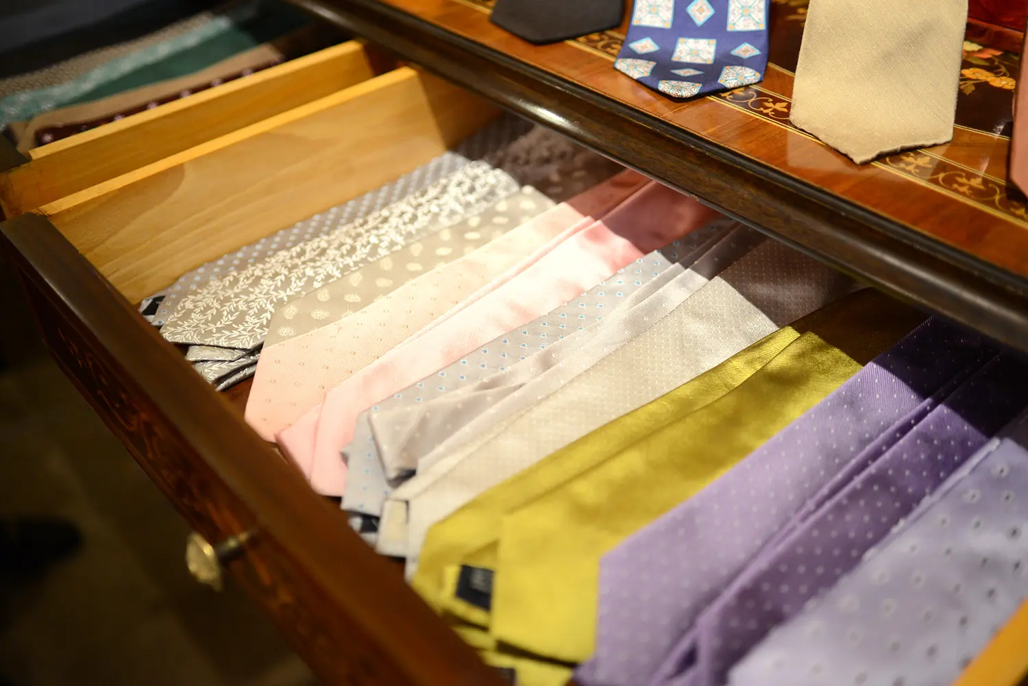プロフェソーレ・ランバルディ静岡には既製ネクタイと、ポケットチーフの取り扱い、そしてビスポークのオーダーが可能です。