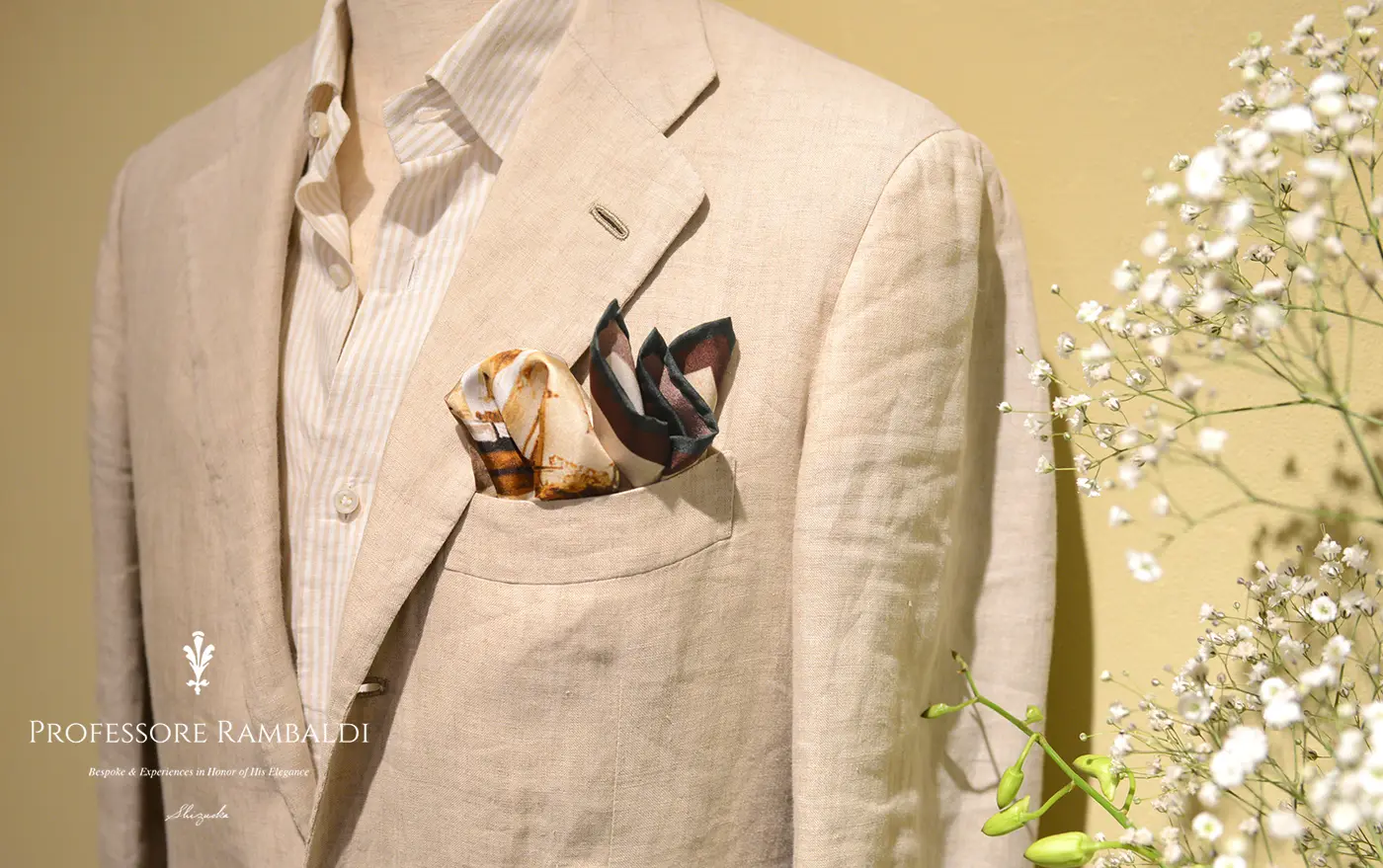 はたまたリネンシャツを合わせつつも、トロピカルウールのスラックスとシルクネクタイやチーフで全体を引き締める。そんな具合でバランスを取るのが大事ですね。