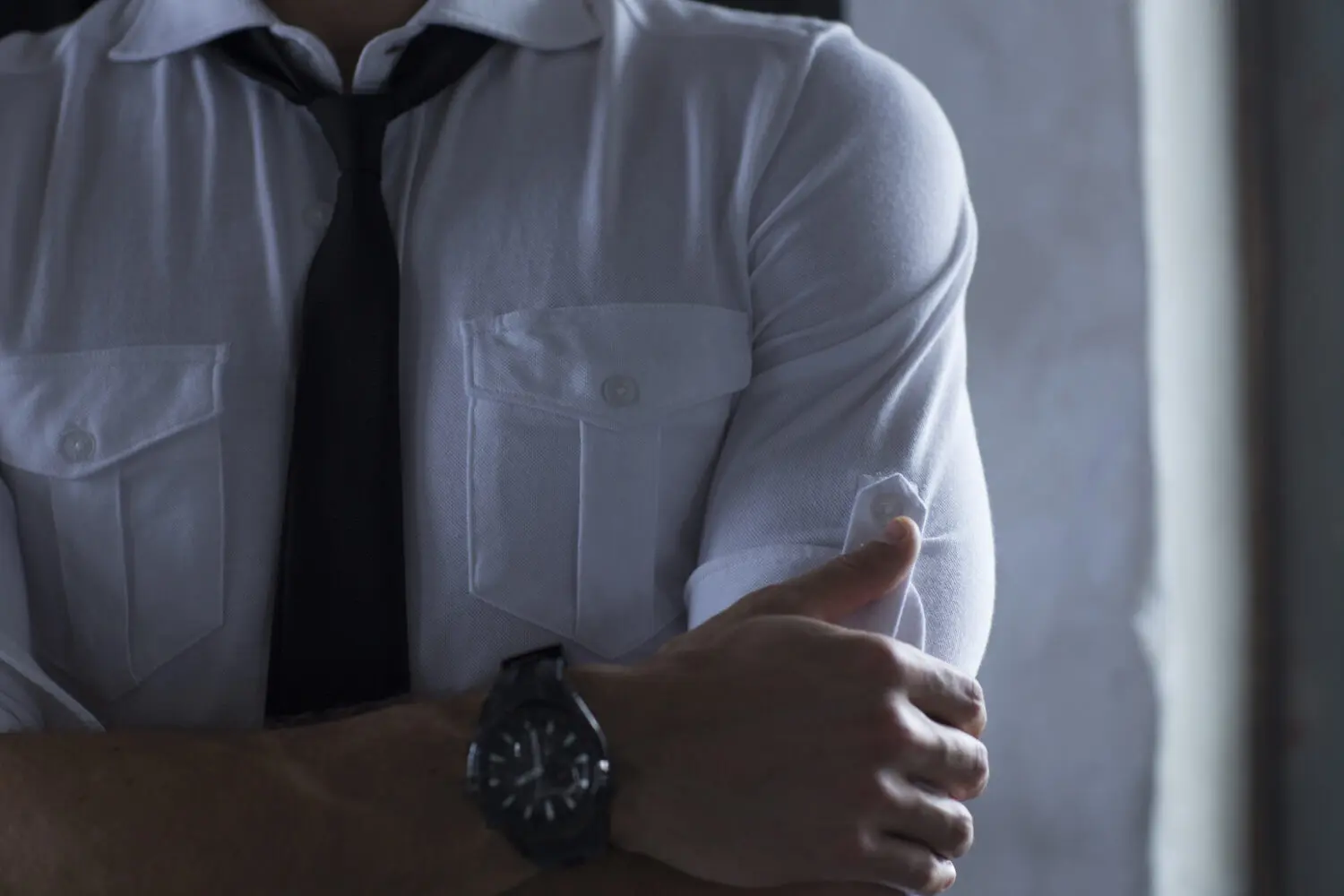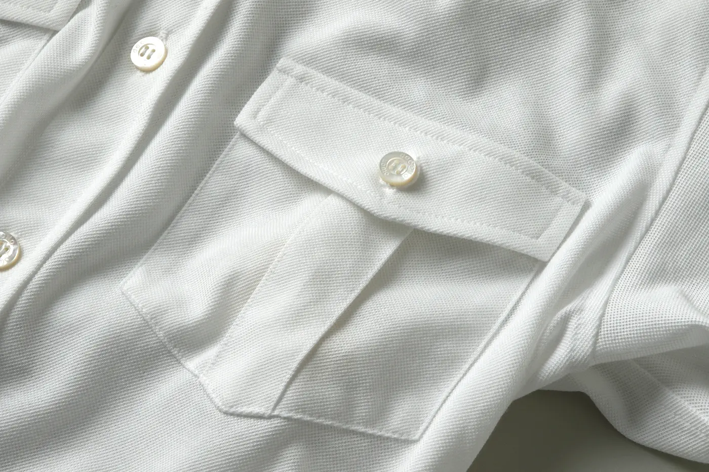 このパイロットシャツにも、このモデルだけのこだわりがあります。例えば胸ポケットはより男らしく、そして綺麗な平行に見えるよう、逆ハの字の角度で取り付けられています。これはちょうどイタリアのスーツの「バルカポケット」にも通じるディテールですよね。