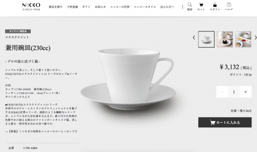 ウェッジウッドやロイヤルコペンハーゲンなども白磁の食器を出していますが、なかでもニッコーの白磁は高品質です。3千円で買えるなんて信じられないほどに軽くて薄くて透明で固い、国産サイコー!となるカップ&ソーサーです。