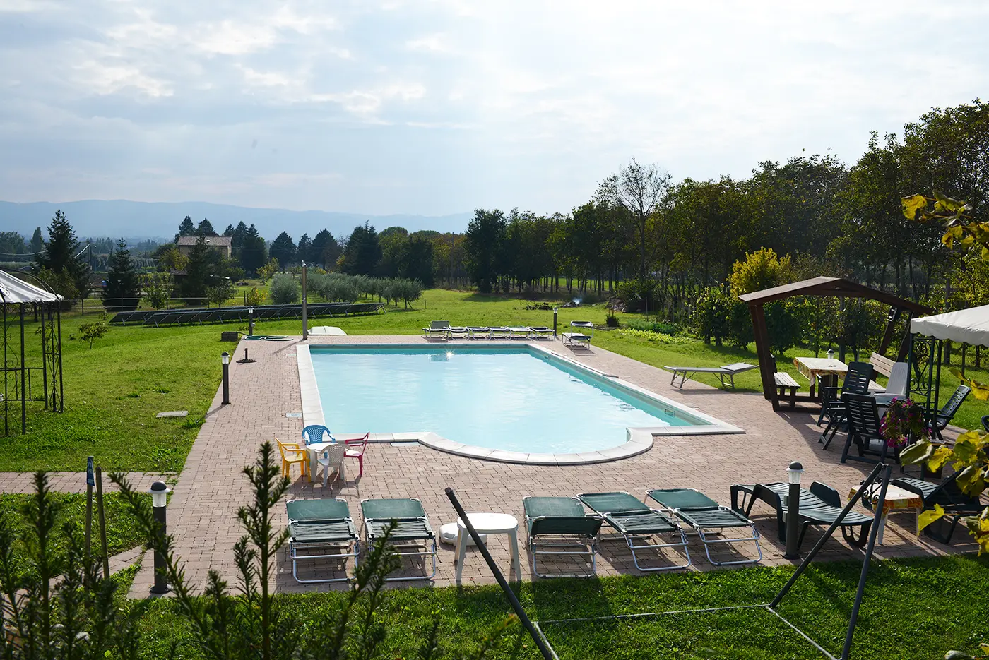 トスカーナに限らずイタリア・カントリーサイドのB&Bはとても敷地が広く、色々なところにベンチやテーブルセットが置いてあったり、それこそプールがあったりというのが普通です。