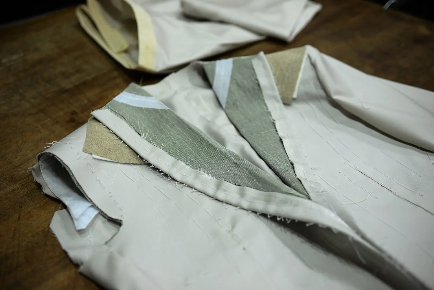 ハ刺しや縫い合わせはもちろんのこと、芯地の縫い付けからしつけ縫いまで全てを手縫いでこなしている。