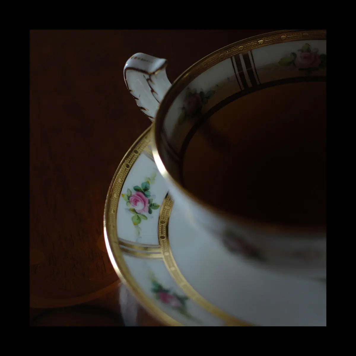 ハンドペイントで仕上げられたミントンのティーカップ、全景を写すのではなく薔薇の絵の一部、それも外からの光が差し込む場所で周りに陰影ができるようにして撮影します。紅茶を注いでいる中にも映画のフィルムを切り取ったような静寂を感じられます。
