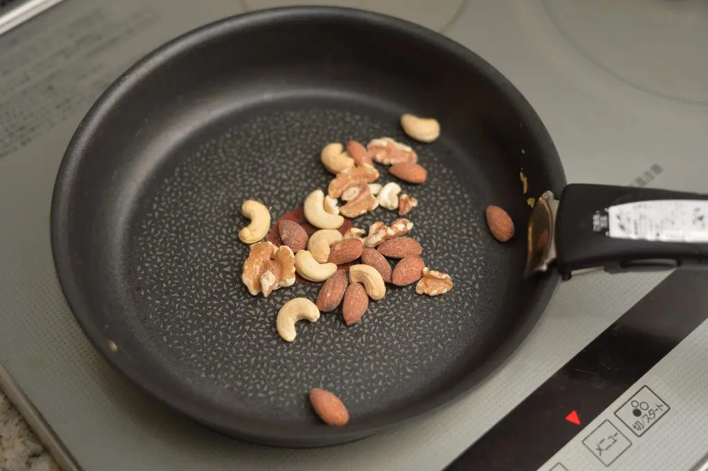 このとき素煎りの食塩・植物油不使用のもので、もし塩味が欲しい場合は、ミネラル感のある天然塩を指ひとつまみ入れてまんべんなく振ります。