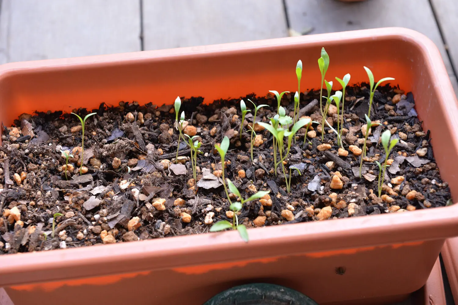 種の間隔は密集させすぎず、筋になるように巻いて、たくさん出てきたら別の場所に移動したり、間引いたりして栄養が1本に集中するようにします。