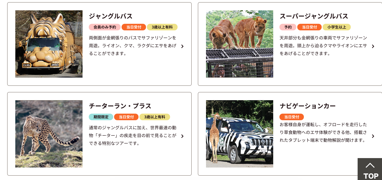 富士サファリパークのサファリツアーは、「自家用車で回る」、「ジャングルバス」、「スーパージャングルバス」、「チーターラン・プラス」、「ナビゲーションカー」と5種類あります。