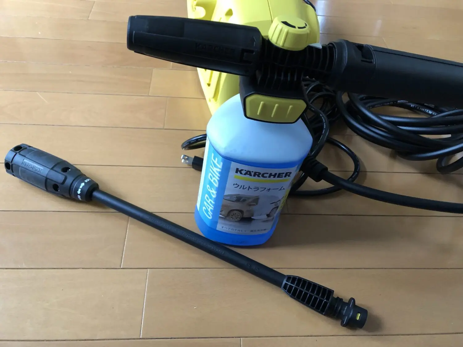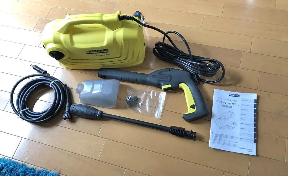 長年欲しかったケルヒャーの高圧洗浄機が来ました!片手で持てるくらいで、家庭用の水道があれば簡単に使用できます。