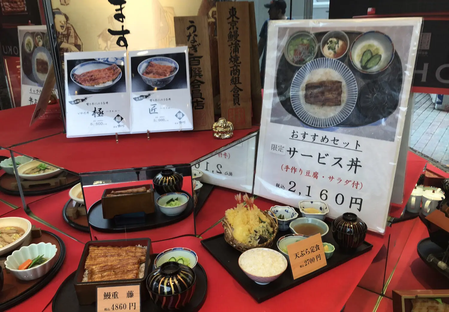 サービス丼は2,160円、鰻重は3000円~5500円です。