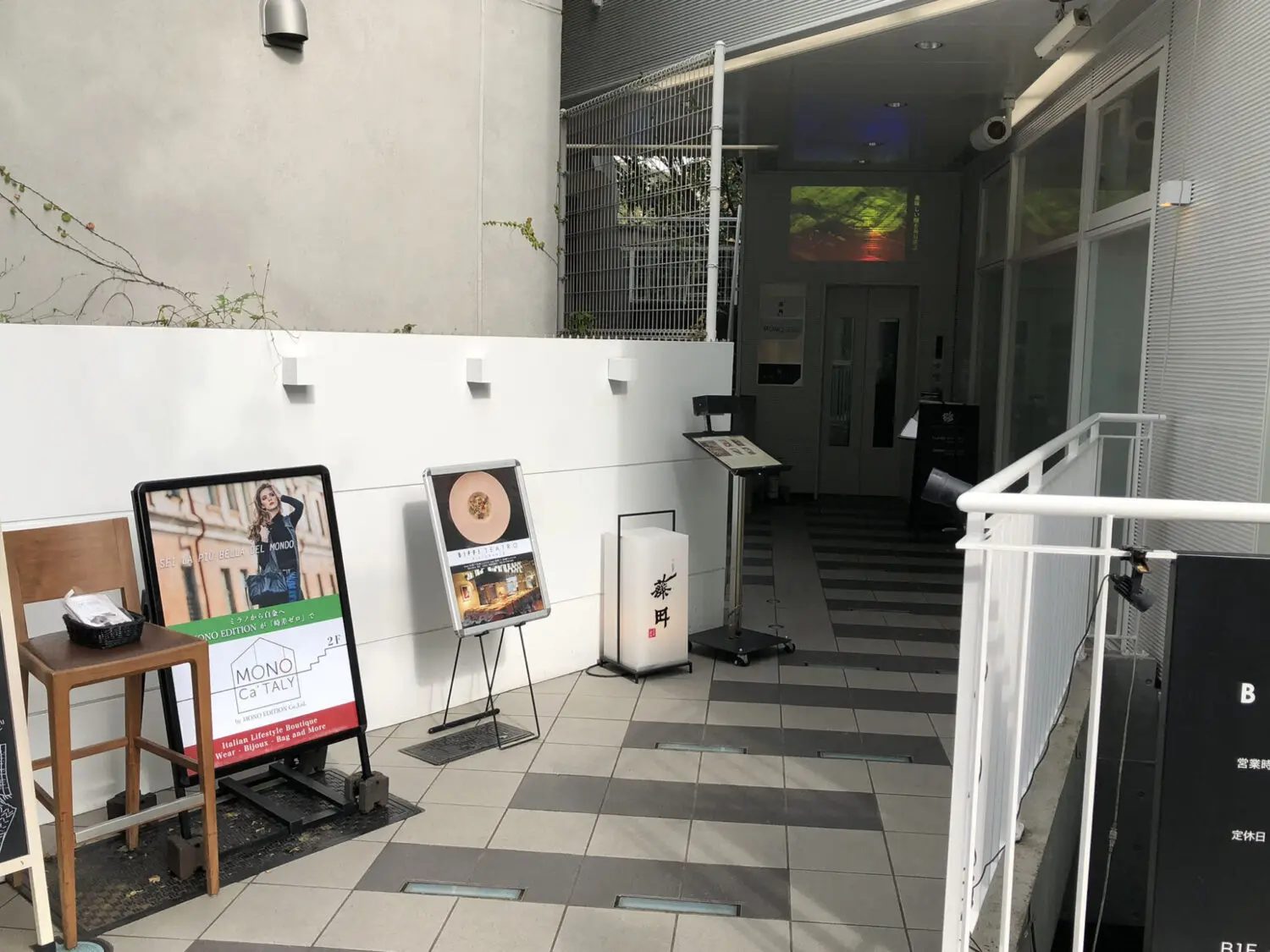 最初に到着したときは、どこにお店があるか分からず辺りを見回したのですが、写真の右上にある3階の建物にお店があります。鰻のイメージとは異なる、モードで今どきな外観です。