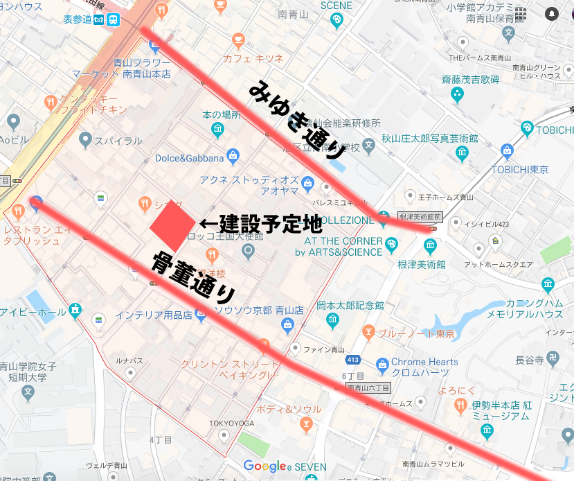 住民説明会で「南青山の一等地に建てる必要性が無い!」と騒いでいるシーンが報道されていますが、この”5丁目”という所は南青山の中でも特に高級店が並ぶショッピングのエリアで、「骨董通り」と「みゆき通り」の中間に位置しています。もともと、骨董通りは「高樹町通り」とも呼ばれて今よりブティックも少なく中島誠之助を初めとした骨董商が数多く立ち並んでいました。
