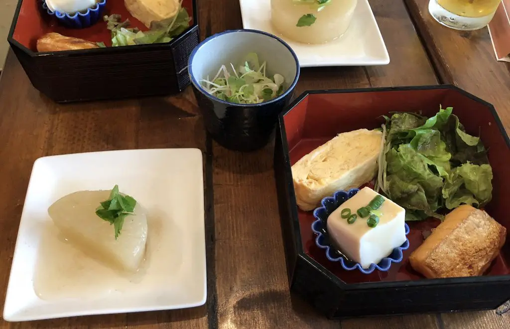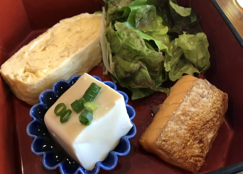 ふろふき大根と、だし巻き卵、豆腐、サラダ、鮭のハラミ。温度が温かくて良いのですが、味は至って普通な感じです。