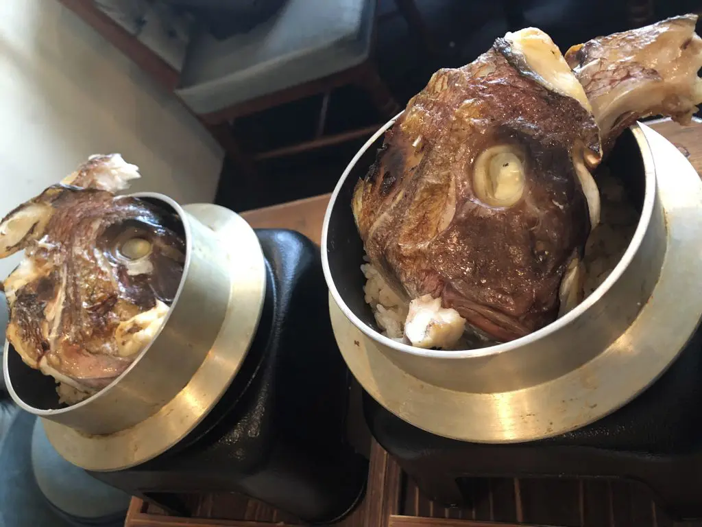 続いて立派な半身の鯛カマが来ます。これを目の前で崩してくてて、お茶碗に持って食べるという流れのようです。