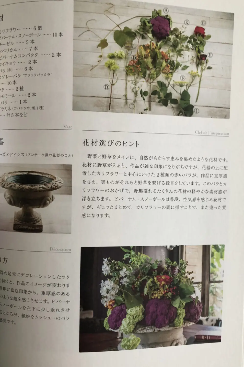 彼の偉大なひとつに、花だけにとらわれず野菜をアレンジメントに追加してしまうところにあります。表紙の写真には採れたての葉の付いたミニキャロットが巻かれています。それだけでなくカリフラワーを主体にしてアレンジしたりと、クラシカルだけでなく前衛的なデザインの一面も併せ持ちます。