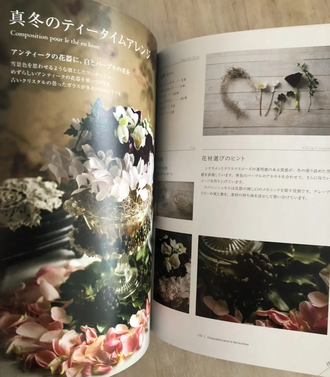 揃える材料とカラーチャート、テクニックのポイントなどを分かりやすく掲載しています。日本のアレンジ本が劣っているわけではありませんが、この本を見ると衝撃を受けるほどに美しいアレンジです。写真の”基本のブーケロン”のような、クラシカルなアレンジメントから、清純なシクラメンとクリスマスローズのコンポジションなど独自のセンスで見たこともないような花の魅せ方をしています。