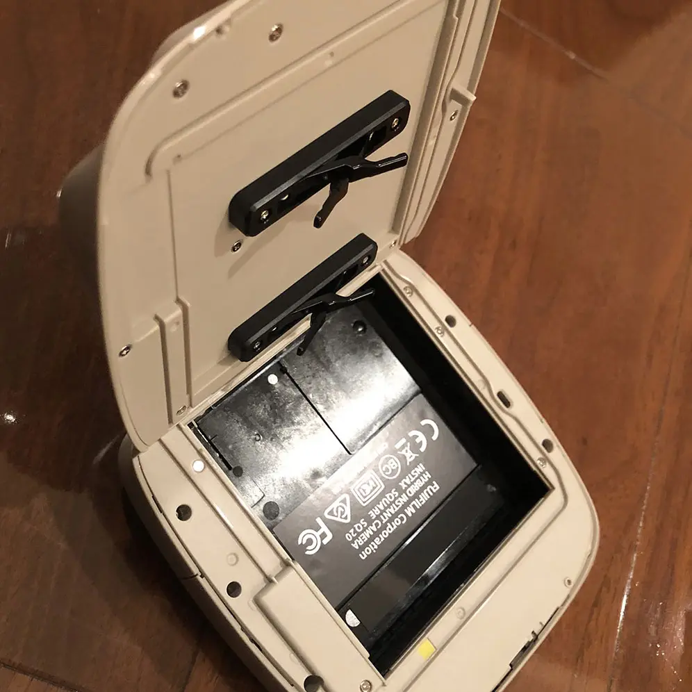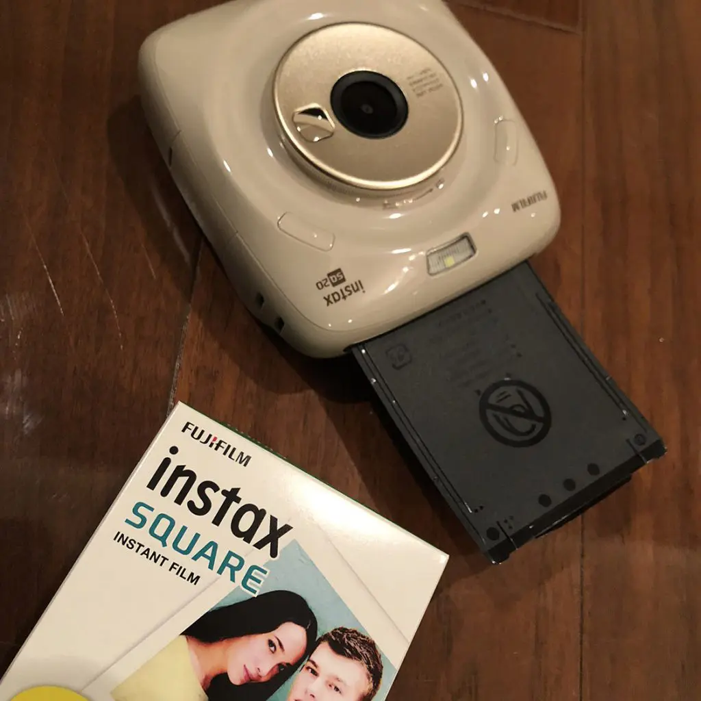 「FUJIFILM スクエアフォーマットフィルム instax SQUARE INSTAX SQUARE WW 1」この専用フィルムをセットします。10枚入りで1000円程度ですので1枚100円ほどでプリントできます。