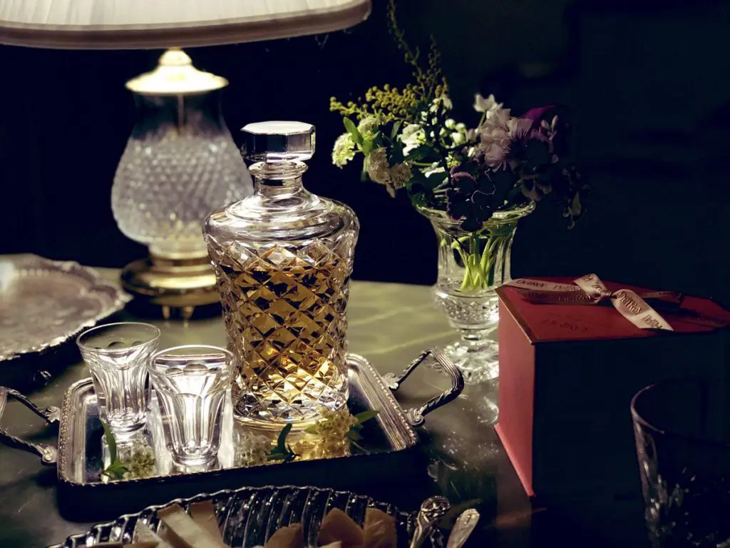 女性と食後の洋酒を嗜むには、WATERFORDのランプや小さなベースに活けたブーケが必要だ。大理石が汚れないように銀のトレーもあるといい。