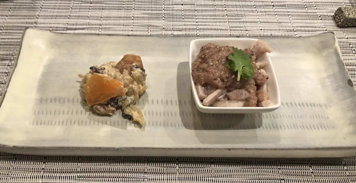 前菜の2品盛り、左が柿とクラゲのクリーム煮。右が美味しい鶏肉の前菜。