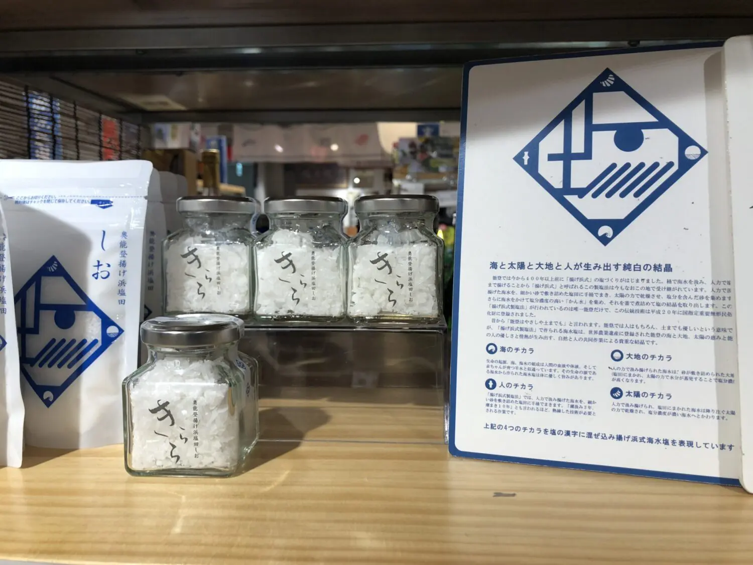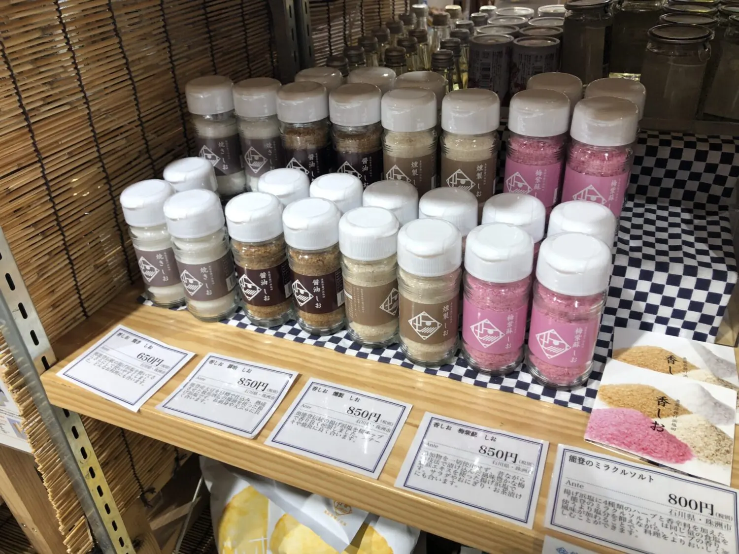 石川県のコーナーでは能登半島の塩が色々あります。変わり塩は天ぷらの時に重宝します。