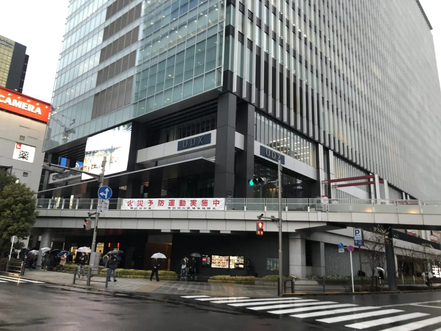 車の場合はUDXの駐車場に止めるのが一番近いはずです。一見わかりにくいですが、右のガード下にあります。