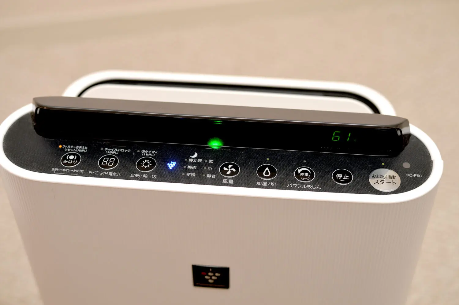 現在の湿度もランプで10%ずつ表示される仕様で、古いKC-F50の方が表示が分かりやすくスマートです。