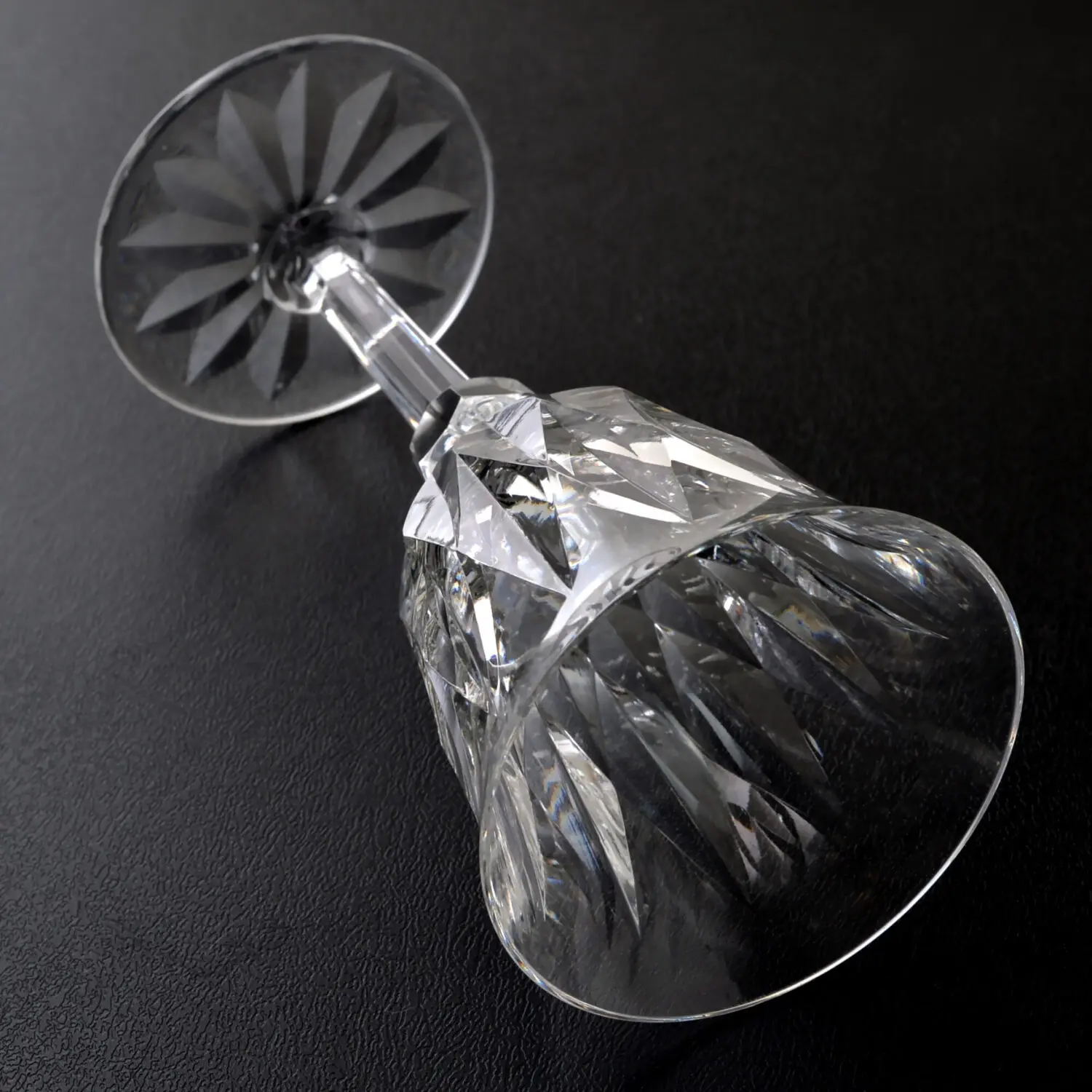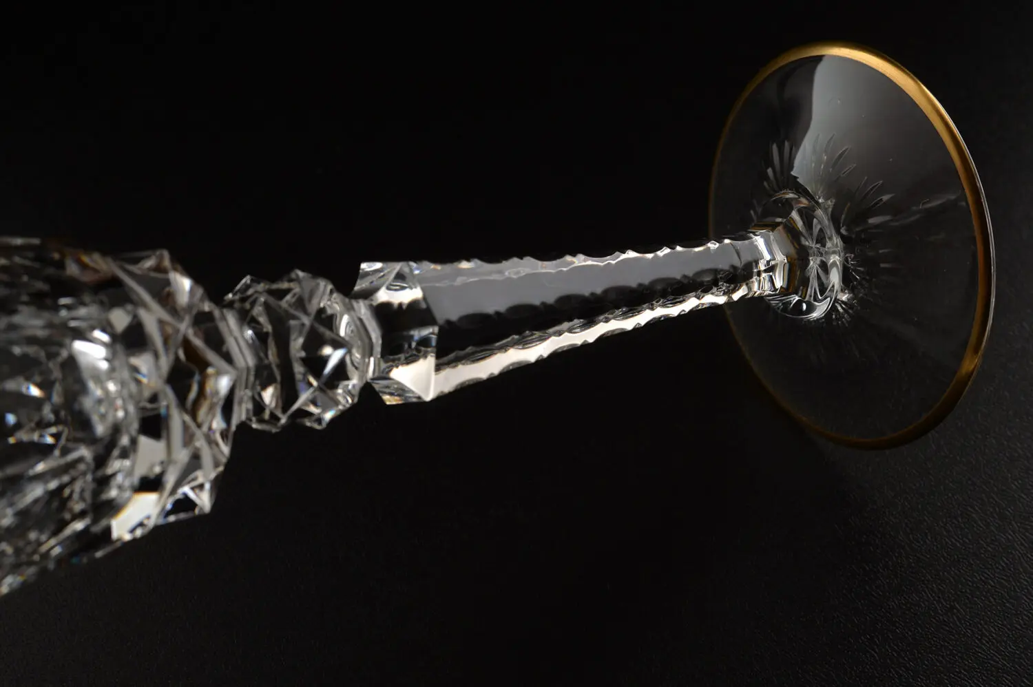 他にもステム部分、ここにもカットを入れることが流行していましたが、のこぎりの楔のように二重の半円が複雑に融合して彫刻されています。底受の部分にも花弁のようにカットが入れられています。