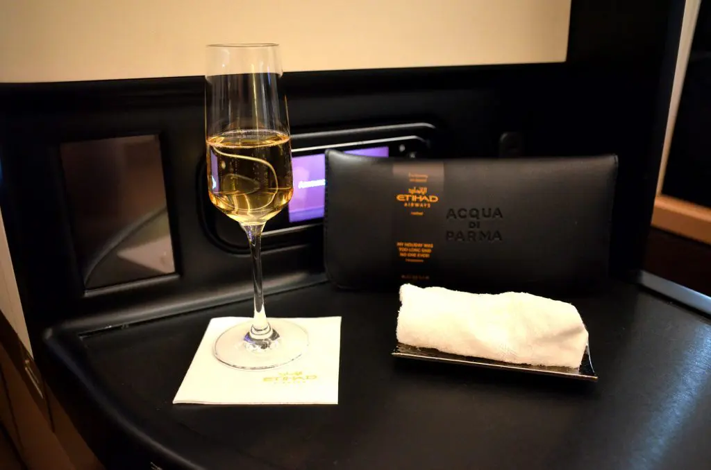 毛布と枕、スリッパ、そしてアメニティセットがあります。航空会社によってアメニティはブルガリ、ジャガー、ダンヒルなど様々ですが、今回はイタリアのアクア・ディ・パルマです。中にはリップクリームやハンドクリーム、ミニ香水、耳栓などが入っています。