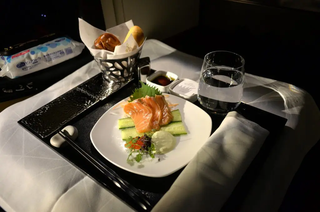 何れにせよ地上で食べる高いクオリティは期待できません。そこで我々は出発の直前に銀座の三越でお弁当を(和洋中)買い溜めてから搭乗しています。手荷物検査でも液体以外は特に何も言われません。そうすることによって美味しい機内食をセルフで楽しめます。