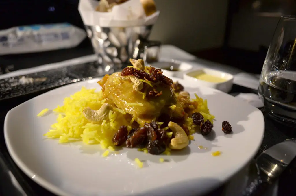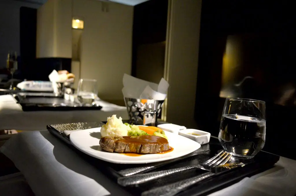 年々サービスの品質が上がっていて、今では雰囲気だけは日本の航空会社を超えるほどです。スポットライトと間接照明を活用したライティングと調度品はまるでレストランで食事をしているみたいです。順番が前後しますが、これはメインディッシュの肉が来たときの写真です。調理はフライト前に行うので、どうしてもレストランのような肉にはなりませんが、なんとか柔らかいまま提供しようと苦肉の策を感じ取れます。